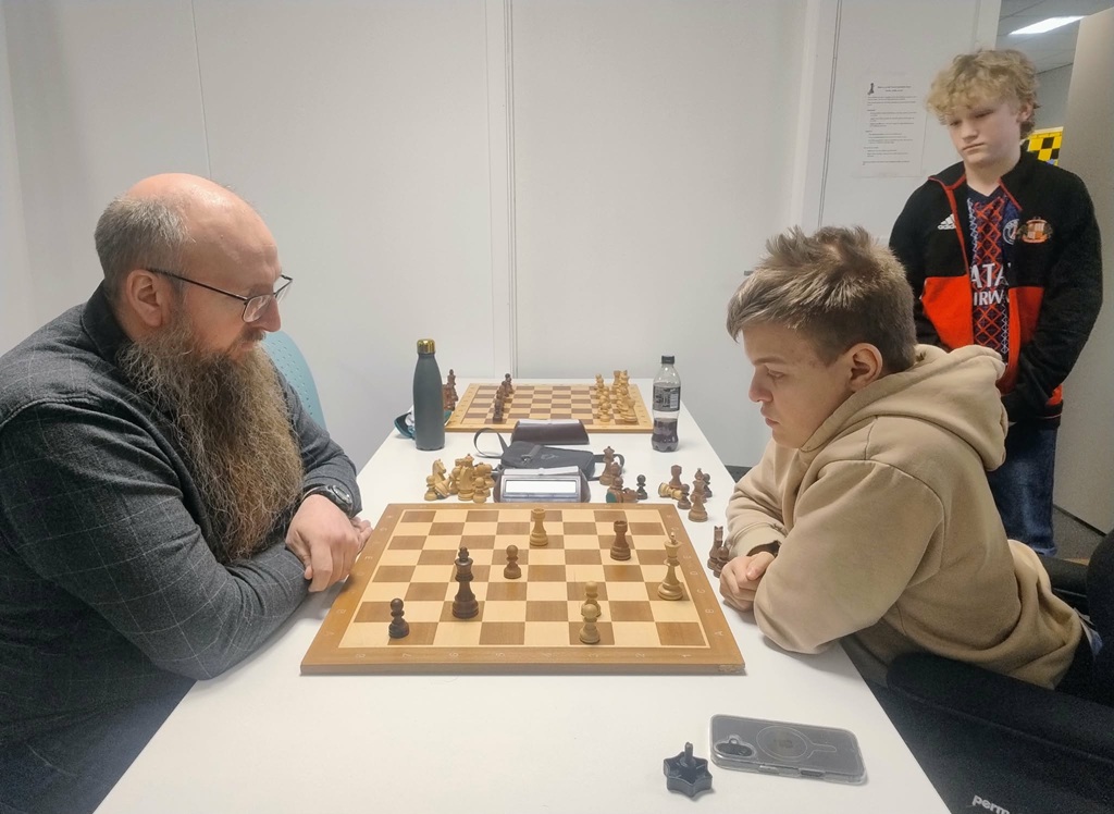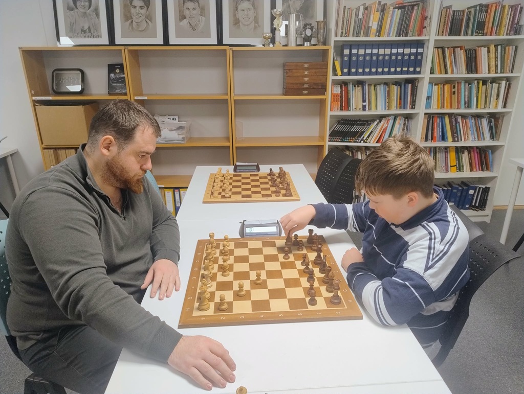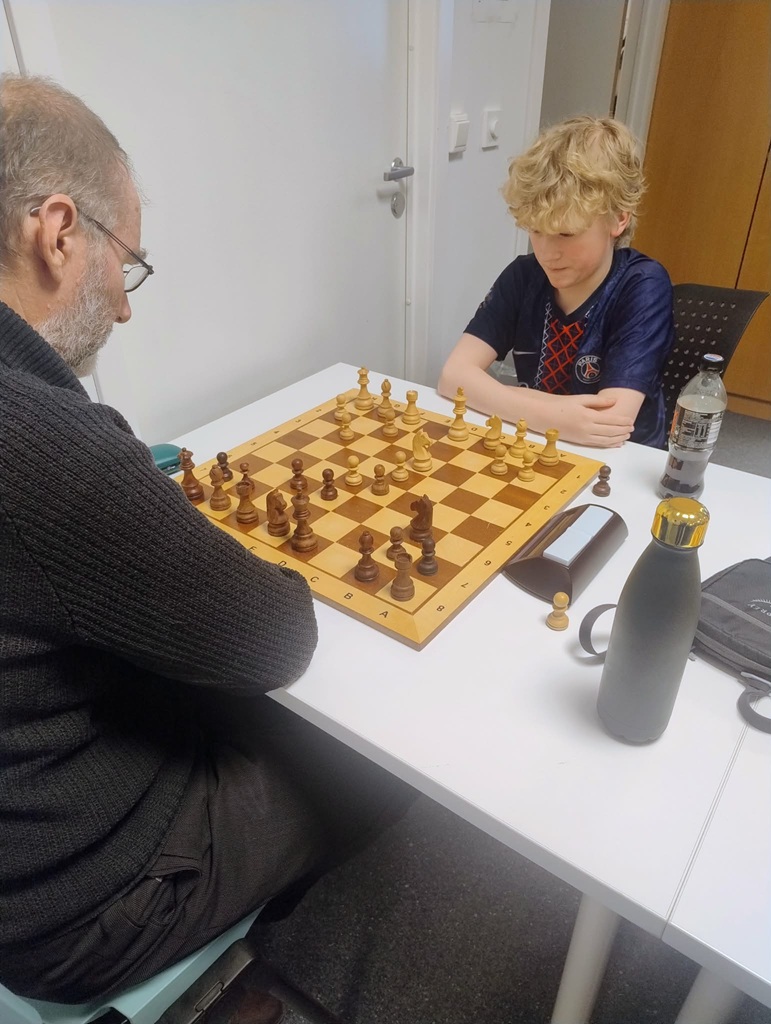 August Solbu er 13 år gammel og vinner her med hvite brikker mot Henrik Nor-Hansen og blir Fischermester