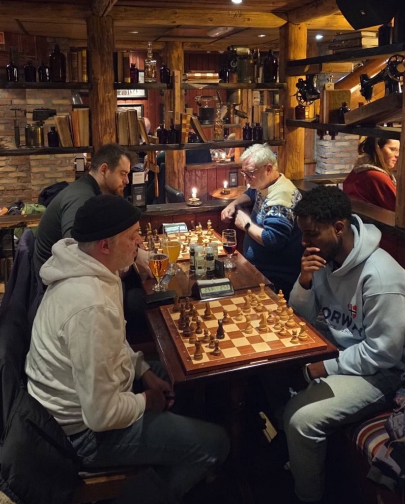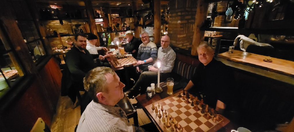 Jan Sigmund Berglund Martin Nagy, Jussi Pedersen, Michael Nilsson, Jon Kristian Røyset, Steinar Moen og Abe var på kafesjakken lørdag og det rapporteres om god stemning og at de fylte glassene og koste seg i hverandres selskap. Det ble selvsagt spilt mye sjakk, noen spiste også på Egon og det ble nok en vellykket kveld med både kafesjakk, sjakksnakk med nogått attåt og alle hadde det fint. Det var ingen turnering denne gang, men spillerne rullerte på brettene og de rapporter om en god tone og en fin ettermiddag i sjakken rike. Det var spesielt moro at den sjakksterke verdensmesteren i backgammon, Jon Kristian Røyset, dukket opp – han er sjelden i sjakken rike nå om dagen. Men han stortrivdes og viste muskler.