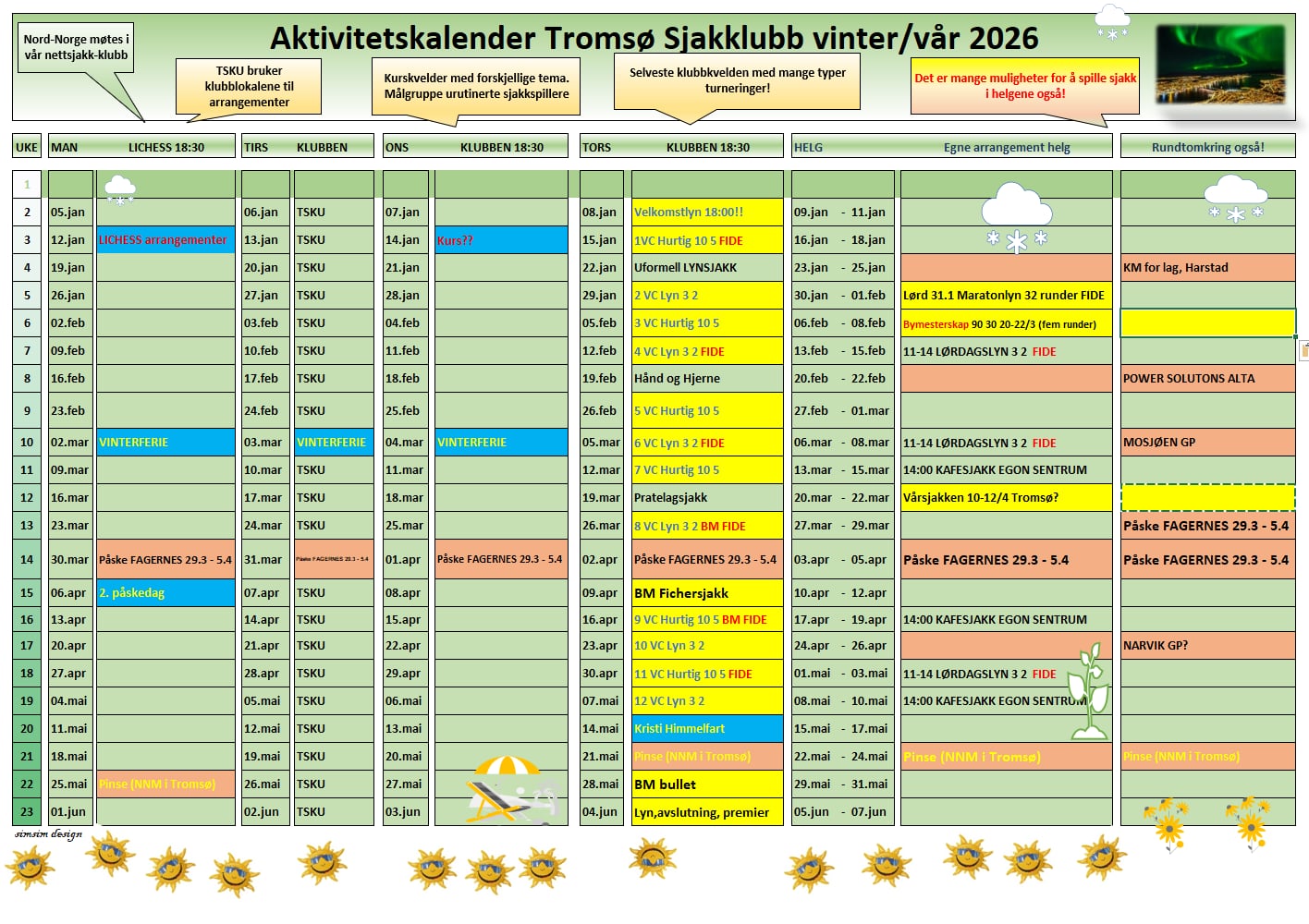 Bymesterskapet spilles 13-15. februar som en helgeturnering med to klasser og 5 runder – vær med på moroa og kos deg med sjakk denne helga. Vårsjakken kommer trolig 20-22. mars med et lite forbehold – den vil bli flyttet om Eliteseriekvalikken tilfeldigvis havner samme helg. Maratonlynsjakken kommer søndag 1. mars! Også i år har vi Vårcupen med 5 klasser og premier til 5 klassevinnere. Det spilles hurtigsjakk og lynsjakk om hverandre i 12 runder! Ellers har vi Bymesterskap i lyn, hurtig, Fischersjakk og Bullet! Vi serverer også pratelagsjakk og Hånd og hjerne for de som liker dette. Vi har også tre lørdager med kafesjakk og tre lørdager med FIDE-ratet lynsjakk. NNM går ellers som en sjakkfestival i Tromsø i år 21.-24. mai – i pinsen. Skal du delta på våre arrangementer i år?