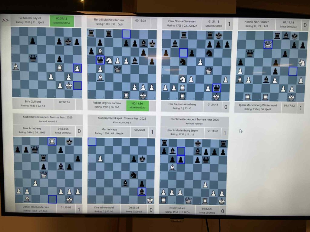 Det kom 16 spillere til Tromsøsjakklubbs klubbmesterskap, men kun 4 spillere var kvalifisert til Mesterklassen som spiller om selve tittelen klubbmester. Det er dog ventet at en rekke spillere som August Solbu, Benjamin Halvorsen og Frank Remman er med når finalehelga spilles 21.-23. november. I Konradgruppa var oppmøtet godt med 12 deltakere og god stemning. Klubbmesterskapet fortsetter torsdag 6/11 med andre runde før vi altså har finalehelg om tre uker. Det blir spennende!