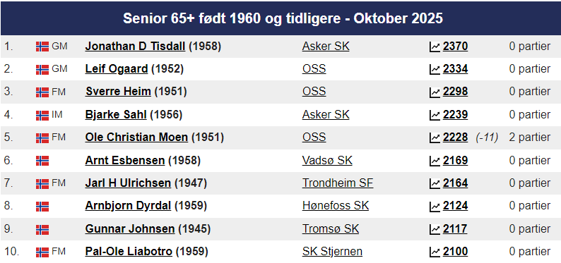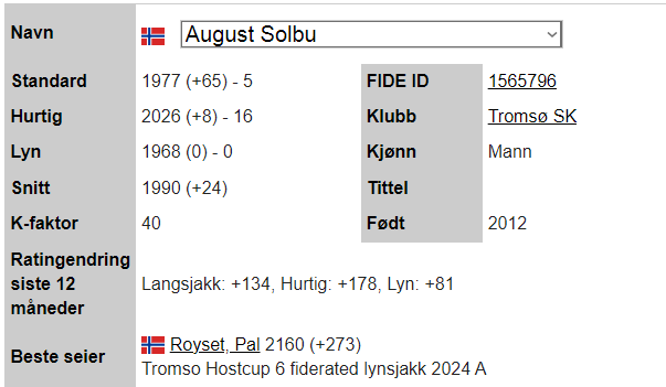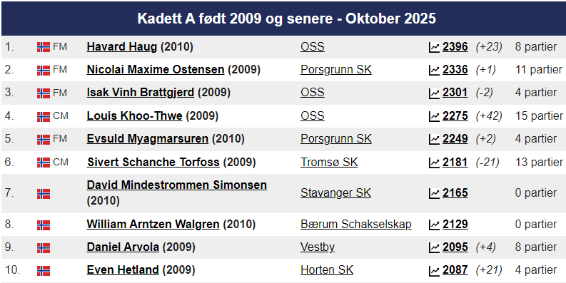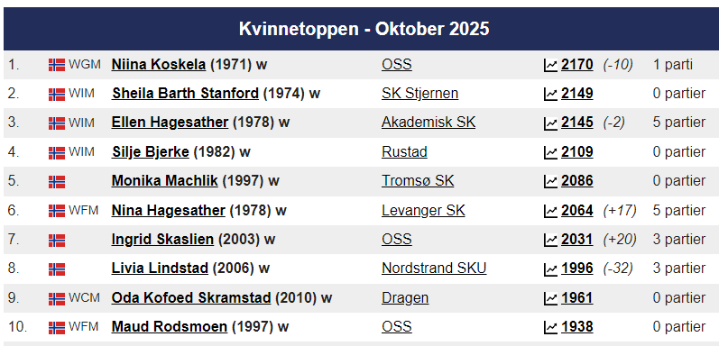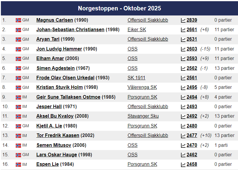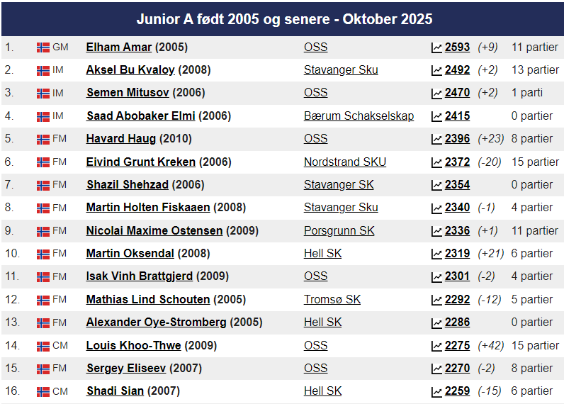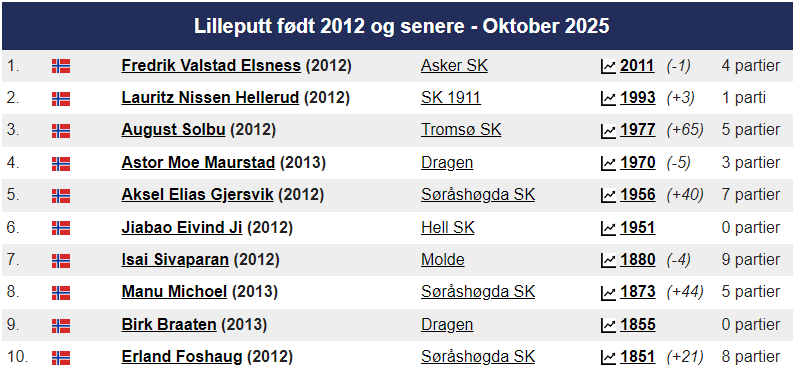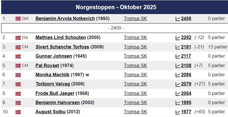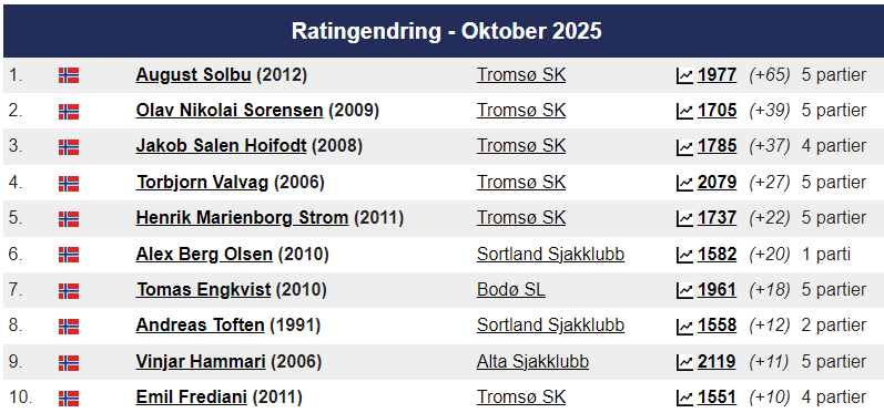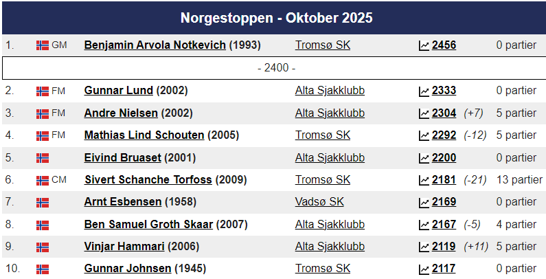 Magnus ligger som alltid på topp hos Norgesratinga og er fortsatt verdensener. Johan-Sebastian Christiansen er toer ,ed 2661 foran Aryan Tari på 2631, mens Jon Ludvig Hammer har 2603. På kvinnetoppen er Niina Koskela Norgesener med 2170, mens Monika Machlik er Norgesfemmer med 2086. På Seniortoppen er Jonathan Tisdall Norgesener på 65+ lista, mens Gunnar Johnsen er nr. 9 med sine 80 år og en imponerende rating på 2117. På Juniortoppen er Elham Amar nr. 1 med 2593, Mens Mathias Lind Schouten fra Tromsø er nr. 12 med 2292. I Kadett er Håvard Haug fra Oslo Norgesener med 2396, mens Sivert Schanche Tørfoss er på en flott 6. plass med 2181. På Lilleputtoppen er Fredrik Elsness fra Oslo topp med 2011, men August Solbu jakter han og er nå oppe på en fantastisk flott tredjeplass med 1977 i Elorating. August går mest frem i Nord-Norge denne måneden og er på vei mot 2000 og Mesterrating! Vi legger også merke til at Olav Nikolai Sørensen er oppe over 1700 i Elo. På Nord-Norgestoppen leder Benjamin Arvola Notkevich foran Gunnar Lund og Andre Nielsen som begge spiller for Alta – men Mathias Lind Schouten er den sterkeste som bor i Nord-Norge med sine 2292. På topplista for Tromsø SK er August nå inne på Topp-10!