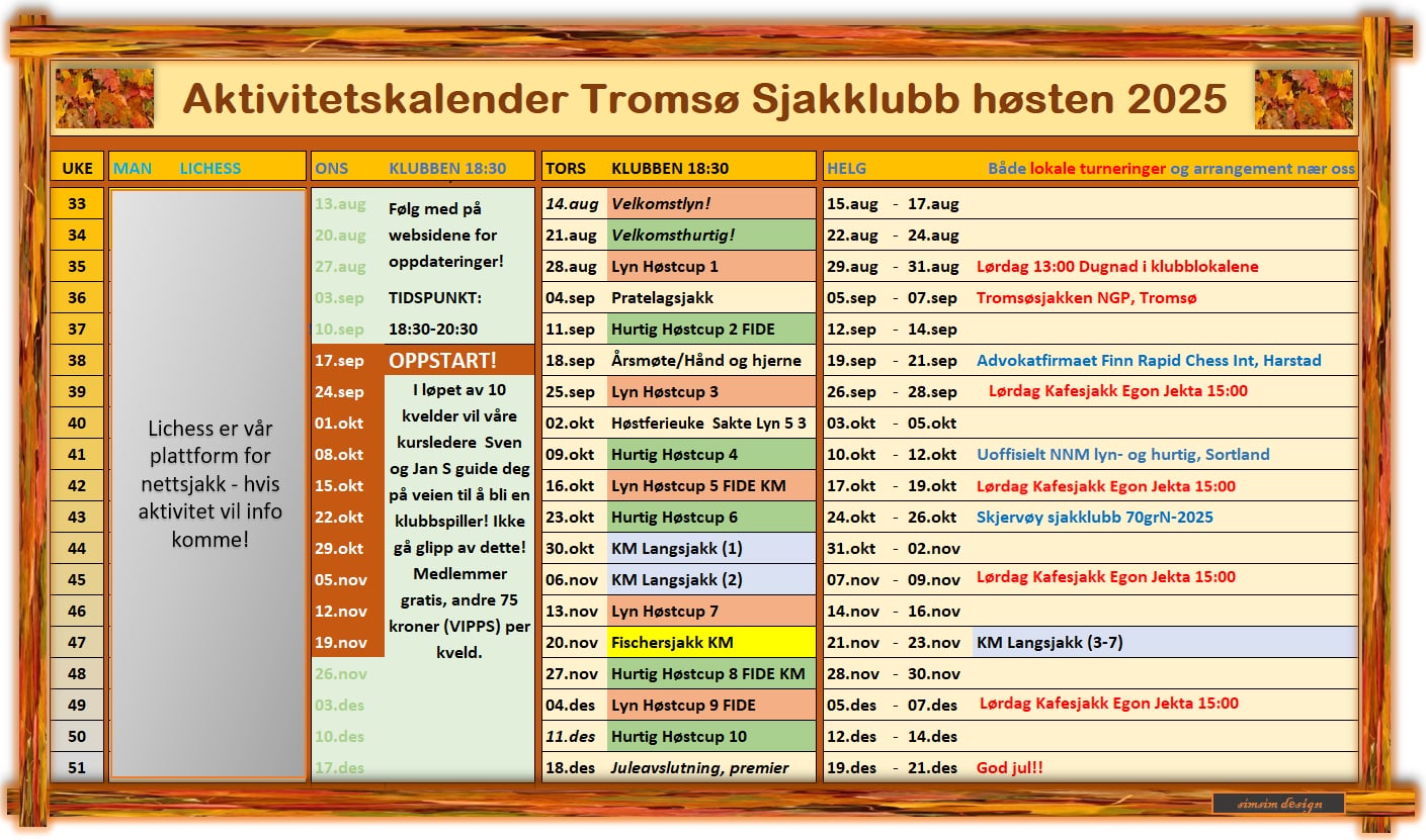 De to erfarne sjakkspillerne Sven Wisløff Nilssen og Jan S. Berglund hadde sin storhetstid på hver sin side av 1990. Utover høsten holder de kurs i mange viktige tema du bør kunne i sjakk for å våge deg på klubben og spille der! Du må kjenne sjakkreglene fra før og spille en del på nett for at dette kurset skal være noe for deg – eller ha sjakk som hobby og spille en del med venner eller kolleger hjemme. Har du en chess.com rating over 800 eller en Lichessrating over 900 bør du våge deg på kurset! Spør gjerne meg om råd for å bli bedre på egenhånd eller kom med spørsmål om du kan komme på kurset hvis du er i tvil om noe – på mail til . Sven og Jan S., som er instruktører på onsdagene, har bred erfaring med både undervisning og egen sjakk og begge vil gå rundt i spilletiden på 75 minutter og gi tips og råd om trekk, planer og ideer i stillingen og komme med avsløringer i etterpåklokskapens lys. Dette er i hovedsak et kurs for voksne over 16 år, men det er ingen nedre aldersgrense, hvis du går i TSKU og klarer å følge med og har en voksen med deg som gjerne er med på kurset selv – så er dette kurset for deg. Det passer klart best for de som spiller en del nettsjakk eller hobbysjakk med venner og kan noe fra før om både det å sette matt og om å få brikkene ut på brettet i åpningen. Kurset strekker seg over 10 onsdager fra kl. 18:30 til 20:30 – se oversikt under.