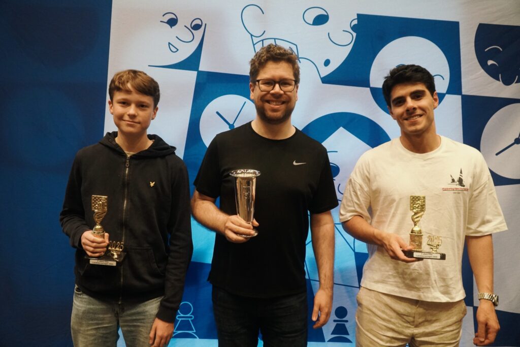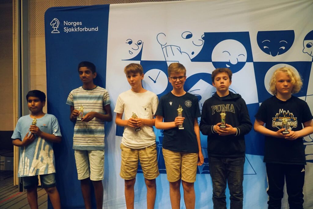 August tok en steike flott tredjeplass og bronse i årets Lilleputtklasse etter seier med de svarte brikkene i et tårnsluttspill i siste runde. Sterkt! I fjor kom August på 9. plass i Lilleputt med 5 av 9 – i år forbedret han dette til 7 av 9 og det gikk lenge mot sølv i Lilleputtklassen før et avgjørende parti med Lauritz endte helt ulogisk med et tidstap for motstanderen. Igjen snøt dermed Oslospilleren Lauritz vår egen August for en enda bedre plassering, men en vakker dag, da! Uansett – det ble en steike flott tredjeplass på August med 7 av 9 og med 27 nye Elopoeng inn på kontoen kunne han si seg fornøyd med mesterskapet. Med i regnestykket må vi ta 2. skjønnhetspris i Lilleputt som gikk til August Solbu for hans praktparti i Sveshnikov med svart mot Githiha Sathish i 6. runde. Skjønnhetsvinner ble Astor Maurstad for han flotte seier i siste runde mot Isai Sivaparan.