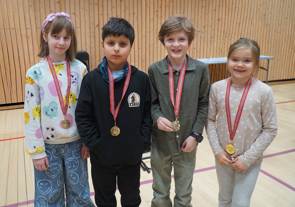 Det er ikke lett å være med på et NMU i sjakk for første gang! Da er det godt å vite at alle fikk deltakermedalje for innsatsen og alle var vinnere – slik skal det være i barneturneringer der det sosiale står i sentrum som et breddearrangement med 391 deltakere. Alle fra Tromsø bodde enten på hotell eller hos familie, så spillerne våre var kun samlet når de var oppe på idrettshøyskolen der NMU fant sted i år. Det rapporteres om god stemning og lek blant barna. Alle koste seg – og alle leverte på en fin tur som ble avsluttet med at de på vei hjem på Gardermoen spilte sjakk på gulvet – og neste mistet flyet i sin iver – men også det gikk fint, så flott Oslo-tur ble det! Vi takker arrangøren 1911 for et fremdragende arrangement, vi takker spesielt Anniken Vestby for fine bilder og vi gratulerer TSKU med en flott fellesreise til Oslo! Jeg vil også gratulere tidligere TSKUer og sjakktrener Tor Fredrik Kaasen som fikk oppleve at tre av sjakkelevene hans i dag i Oslo – vant sine klasser i NMU og ble Norgesmestre – helt enestående!
