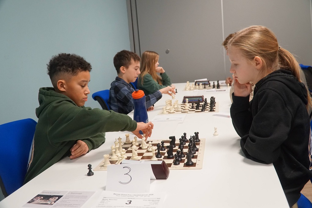 35 spillere i ei barnesjakkturnering høres kanskje ikke så imponerende ut, om saken ses fra det sentrale Østlandet. Men perspektivet er dette: Miniputten Marius fra Skjervøy må kjøre bil i seks-syv timer hver vei for å spille helgeturnering i Harstad. 12 Tromsøspillere kom med hurtigbåten som har dobbelt så lang reisetid som ei flygning Tromsø-Gardemoen. Familiene hiver seg rundt, organiserer og setter av helga. Det har blitt kultur for å delta på hverandres turneringer i nord. Vi er mange som har funnet ut at det er verdt det. Og når mange er med, blir det ekstra gøy. Ungene blir kjent på tvers av klubbmiljøene. I Harstad var det 13 deltakere fra arrangørklubben, 12 fra Tromsø, 5 fra Narvik, 4 fra Sortland og 1 fra Skjervøy. Det er stas å møte de man ikke trener med til daglig i et parti. Man vet aldri hva som venter. Flere nykommere hevda seg ved brettet. Det var også flere lilleputter med enn tilfellet har vært de siste turneringene.