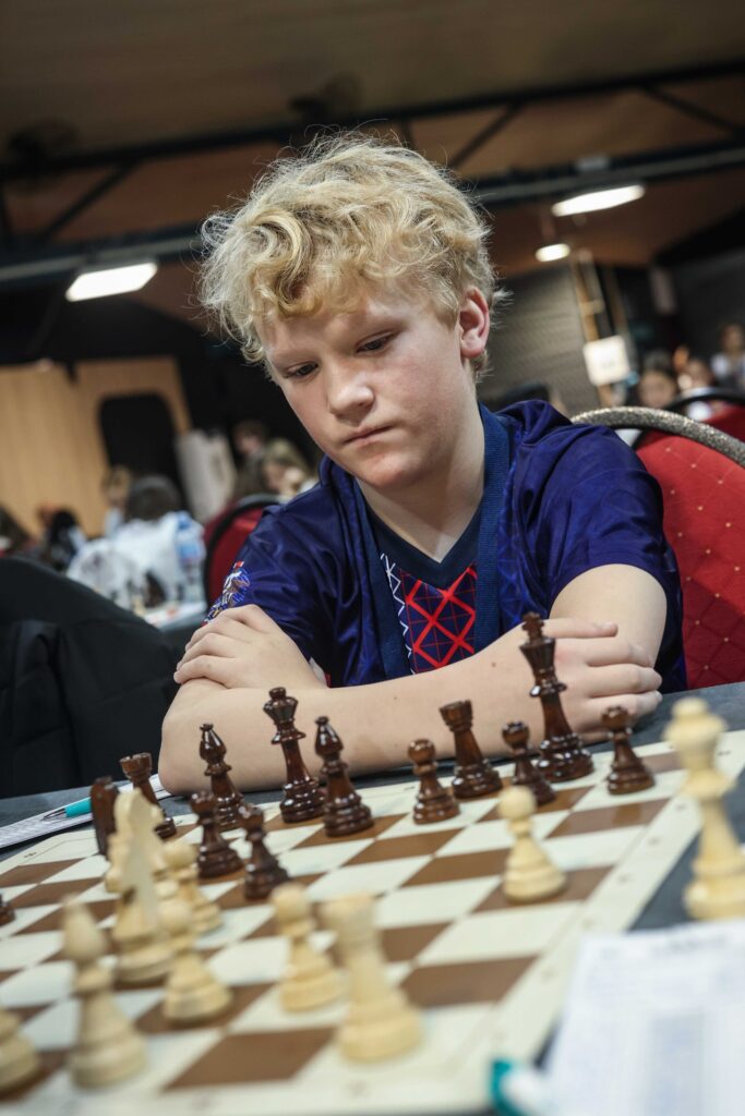 August Solbu spilte i klassen under 14 år og tok ett poeng på de tre første rundene i EM. Han vant mot Alp Tigani, før han tapte mot sterk motstand i Edoardo Fulgentini (2170) og FM Erik Golubovic (2334). En helt grei start for 12 år gamle August som var en læregutt i EM. August fortsatte med et tap mot Ramon Magi (1773) fra Estland med svart i fjerde runde, en spiller som storspilte mot August, før vår mann slo Stefan Mihajlovic (1627) fra Montenegro med hvit i femte runde. Så ble det et nytt svarttap mot Vito i Nimac-Kalcina (1838) i sjette runde og August sto da med 2/6 og turneringen var kjørt. I syvende runde slo han Ivan Lytvynenko (1721) fra Tyskland før han i åttende runde tapte for Manuel Tenreiro (1860) fra Portugal med svart. I siste runde slo han til med en hvitseier mot en kypriot og dermed endte August på 81. plass i EM med 4 av 9 mulige. Trøsten får være at ingen norske i denne klassen tok flere poeng, at EM alltid er tøft for de norske som i år blødde rundt 500 fete Elo-poeng totalt og August alene ga bort 84 Elo-poeng. En tøff realitetssjekk over hvor de hardeste konkurrentene ligger i starten av turneringen, men også mye lærdom å ta med seg hjem og jobbe videre med! Men skal jeg være ærlig – så var mange av August sine feil i turneringer mer preget av dårlig form, bukking og klare overseelser – enn svak sjakkforståelse og dårlige ferdigheter. Så vi håper han får flere sjanser til å spille EM og til å vise hva som bor i han når toppnivået er inne!