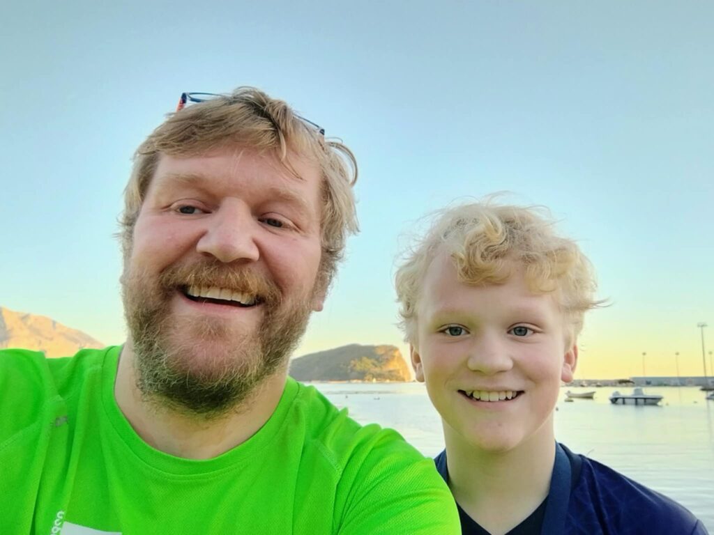 Pappa Askild sammen med sønnen August ved Adriaterhavet ved hotellet