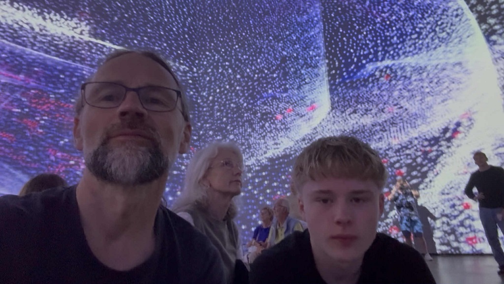 Pappa Trond Tørfoss og Sivert på det berømte Guggenheim museet i Bilbao