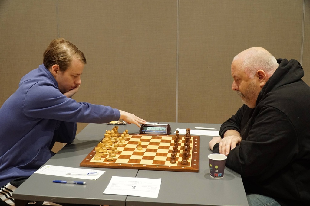 Robert Jakobsen slår her Olav Nikolai Sørensen med hvite brikker og går til topps i B-gruppen