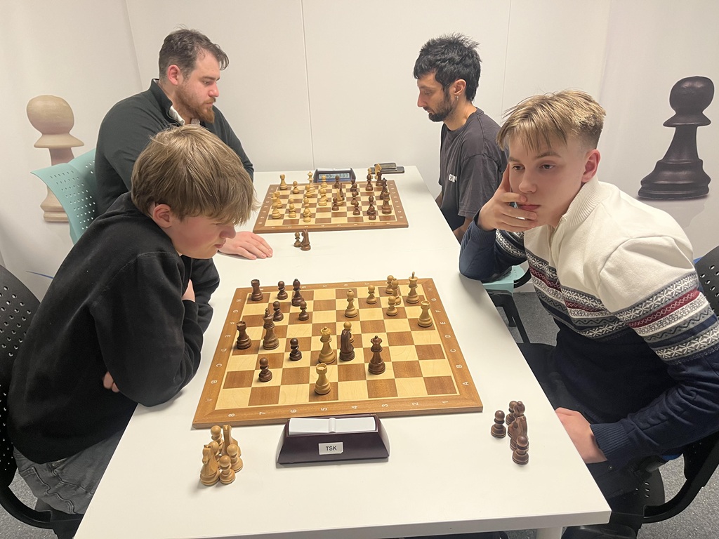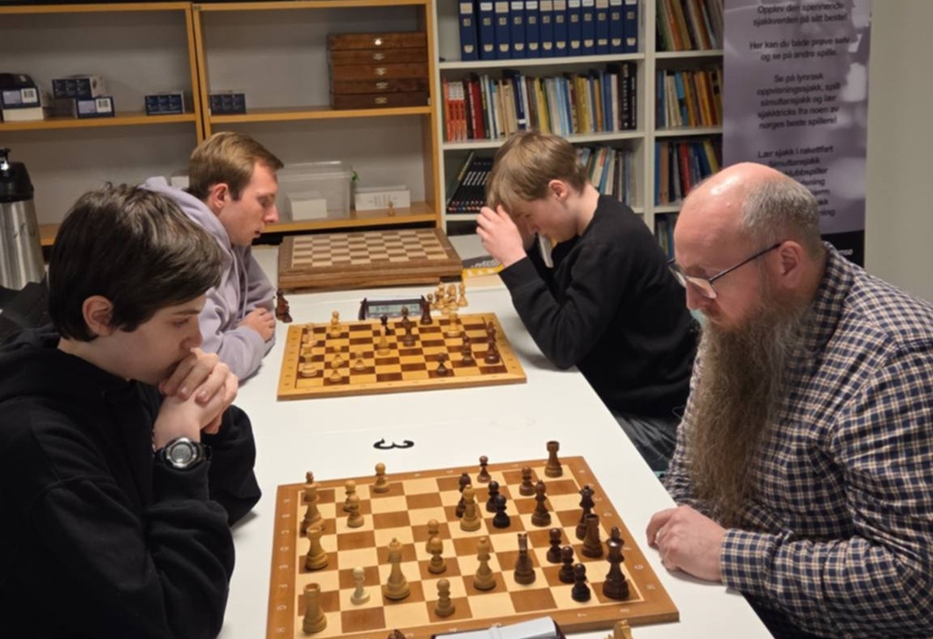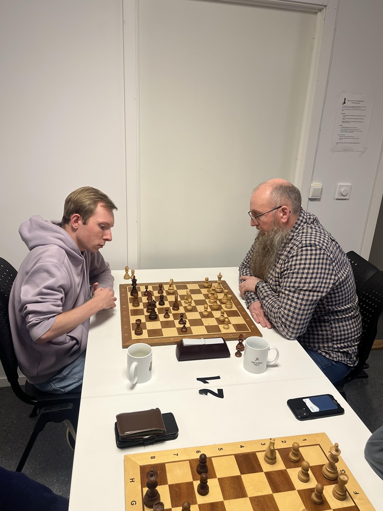 John Joensen med sin aktive sjakk har en helt spesiell klem i spillet sitt når det sitter og denne kvelden skulle det sitte bra selv om han også hadde marginene på sin side. I første runde slo han TSKU sin Emil Frediani, en habil klubbspiller som er sterk nok til å nappe et halvpoeng eller to fra John i sine lyseste øyeblikk. Så gikk Axel Øvrebø Harstad ned i andre runde før det skjebnesvangre møtet med August i tredje runde. August fikk her opp en overlegen stilling med to bønder over og +4 på maskinanalysen, men det ville seg ikke for den unge helten i klubben vår som ble Norgesmester for ungdom i 2024. August slet med klokka og ble felt til slutt som ei stor julegran som faller i snøen før jul. John bruker alle midler og av og til må svindelen også tys til. I fjerde runde slo John til med ny seier, denne gang mot Birk Gulljord før han sikret førsteplassen i gullkampen i siste runde med en svartseier mot Henrik! En sterk seier av færøyværingen John ble det!