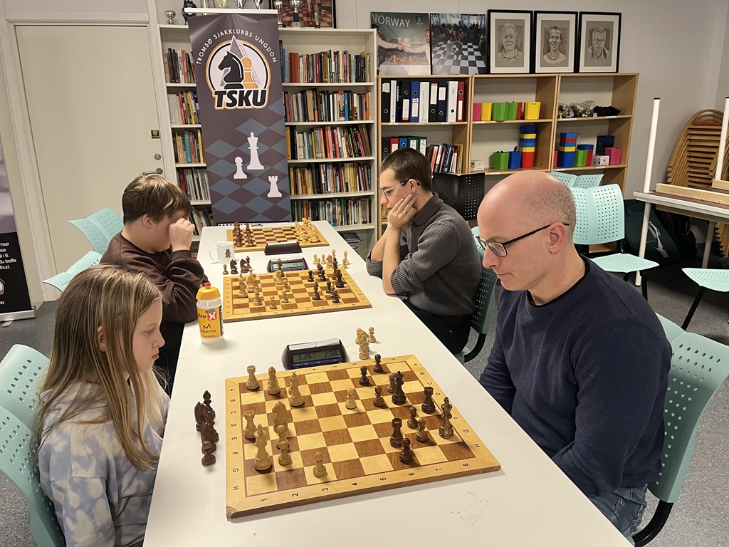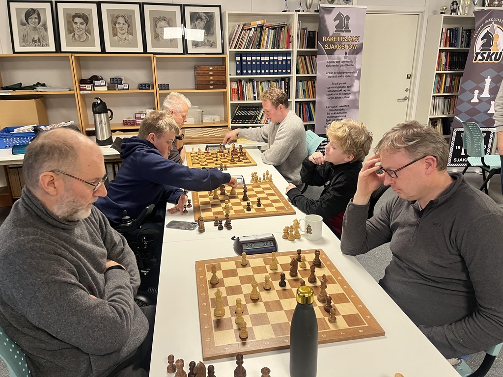 Henrik Marienborg Strøm var virkelig på hugget, og startet friskt med remis mot sterke Pål og deretter klinket han til med et tårnoffer på h7 mot Francisco – noe som førte til ugarderlig matt. Med påfølgende seire mot Hallvard og Åge, så sto han plutselig i en finale mot John Joensen! Til tross for tap her, ble det en sterk 1963-prestasjon. August og Pål var bleke denne kvelden og begge er ikke i sin beste form. Pål sliter sjakklig for tiden og overser for mye, mens August bruker for mye tid og kommer i heftig tidsnød. Mot vinneren John hadde August to bønder over og klart vunnet stilling, men han spilte det bort i tidsnøden. Kanskje var begge litt mettet etter Power Solutions-turneringen i Alta sist uke, hvem vet. Vi la ellers merke til at nestorene Hallvard og Henrik Sr. hadde gode prestasjoner, mens spesielt Ylva var god blant de yngre med en tett på 1800-prestasjon. Ylva slo både Arve Skar og Emil Frediani og hadde en god kveld. Frank Remman fikk inn et klassisk løperoffer på h7 med påfølgende springersjakk på g5 mot Stjernens Axel Øverbø Harstad. Men i den påfølgende tidsnøden, etter et festlig og sterkt angrep, så bukket Frank dama og partiet. Fort gjort! Ellers ble dette en uvanlig lang turnering. Selv etter halvtimes spilletid i 1.runde, var det full aktivitet på de to første bordene, som begge endte remis. Torbjørn lå materiell under mot Martin, men hadde sine trusler med to fribønder. Martin ofret til slutt sin springer på den ene bonden og den gjenværende h-bonde ga da remis. TSKU-erne kommer og selv om det ikke ble noen virkelig store skalper på dem denne kvelden, så ga Birk rosende ord om Mathias Heitmann Jaklin spill i deres oppgjør i andre runde. Til slutt nevner vi at Henrik Nor-Hansen tok over 50% denne gangen etter at han spilte hjem en svært etterlengtet seier mot Pål Røyset! Det ble altså nok en gang en trivelig kveld på klubben med mye spennende spill, god stemning og kampsjakk over hele fjøla!